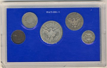 Bestående af: indian head penny 1891, barber dime 1914, liberty nickel 1907, barber quarter 1907 og half dollar 1912.