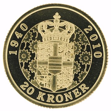 Denne 20 kr mønt i proof version, præget på den Kgl. Mønt, er udgivet i anledning af Hendes Majestæt Dronning Margrethes 70-års fødselsdag d. 16. april 2010.