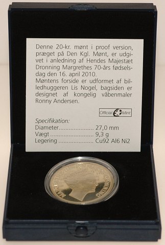 Denne 20 kr mønt i proof version, præget på den Kgl. Mønt, er udgivet i anledning af Hendes Majestæt Dronning Margrethes 70-års fødselsdag d. 16. april 2010.