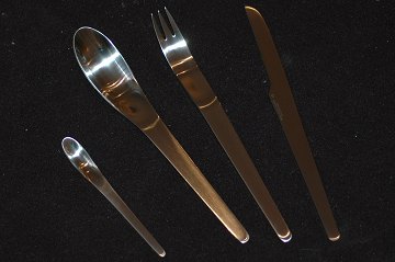 Bestående af 4 middagsgafler, 4 spiseskeer, 4 spiseknive m. langt skaft samt 5 kaffeskeer. Udført i rustfrit mat stål. Produceret hos Georg Jensen.