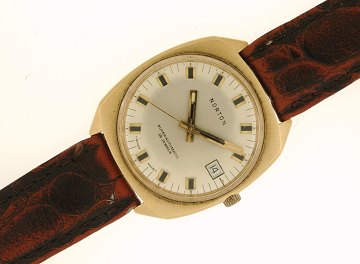 Spændende herrearmbåndsur fra Norton m. urkasse af 14 kt. guld, sølvfarvet skive, plexiglas, datoangivelse ved 3" position, rem af brunt læder.