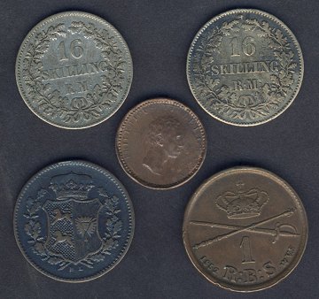 Samling bestående af: Frederik VI, 3 skilling 1812, 2 stk. Frederik VII, 16 skilling 1856, rigsbankskilling 1852 (H. 12A) samt dreiling 1850.