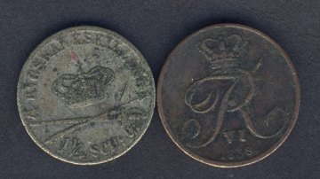Frederik VI, 1/2 rigsbankskilling 1838 (H. 38) samt Christian VIII, 4 rigsbankskilling 1842 VS (H. 8B).