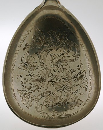 Stor ske af sølv fra slutningen af 1800-tallet m. fint mønstret punselarbejde i form af bladranker. Fremstår m. initialer. Stemplet "R.Jensen" tre tårne og "96". L. 28 cm.