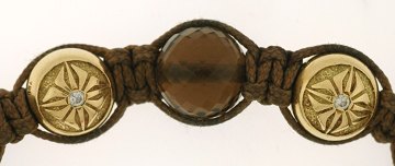 Shamballa armbånd prydet med gulguldskugler af 18 kt. guld samt facetterede kvarts trukket på brun snor. De to guldkugler er begge prydet m. én brillantsleben diamant på ca. 0,03 ct. og det firkantede logo, ligeledes i 18 kt. guld, prydes af en diamant på ca. 0,015 ct. Samtlige diamanter er vvs TW.