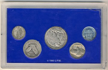 Bestående af: penny 1943, dime 1943, 5 cent 1935, quarter 1926 og half dollar 1945.