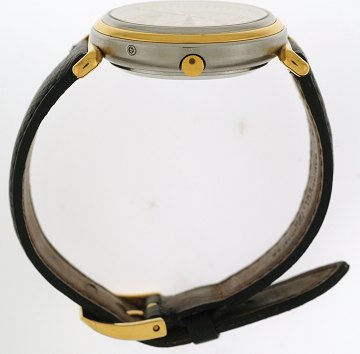 Elegant herrearmbåndsur fra Kelek ref.nr.: 5352-M-4-A-S2 m. kasse af delvist forgyldt stål, ugedag-, dato- og månedsangivelse, samt separat datoangivelse ved 7" position, safirglas, automatic, "åben" bagside m. safirglas og sort læderrem. Diam.: 36 mm.