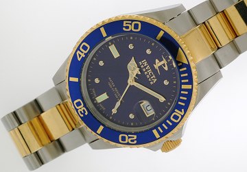 Populært herrearmbåndsur fra Invicta modelnr.: 6870 af delvist forgyldt stål, m. blå/"guld" lynette, safirglas, blå skive prydet m. 8 brillantslebne dimanter, datoangivelse ved 3" position, automatisk urværk. Diam.: 43,5 mm.