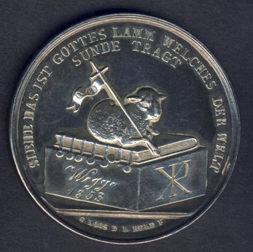Meget velbevaret dåbsmedaille af sølv prydet m. Johannes Døberen på den ene side samt et lam liggende på en bibel på den anden. På den forhøjning hvor lammet ligger er der indgraveret "Wiggo 1853".