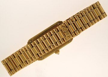 Eksklusivt damearmbåndsur fra Corum m. inderkasse i form af en 5 gr. finguldbarre, hvorom ydrekasse af 18 kt. guld, tilhørende lænke ligeledes af 18 kt. guld m. foldelås, safirglas, quartz urværk. Diam.: 16,8 x 28 mm.
