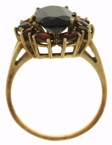 Ring af 8 kt. guld prydet m. større facetsleben granat omkranset af 10 mindre. Stemplet "333". Str. 58.