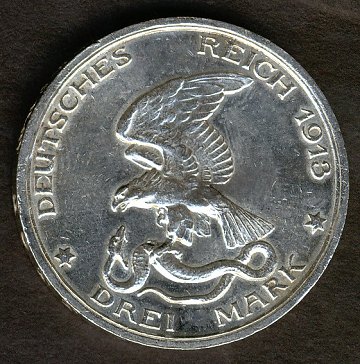 Preussen, 3 mark SØLV 1913A - KM 534