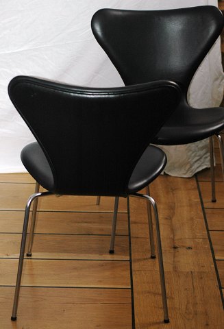 2 stk. model nr. 3107, stel af satinforkromet stål, skallen betrukket med originalt sort læder. Produceret hos Fritz Hansen