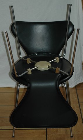2 stk. model nr. 3107, stel af satinforkromet stål, skallen betrukket med originalt sort læder. Produceret hos Fritz Hansen