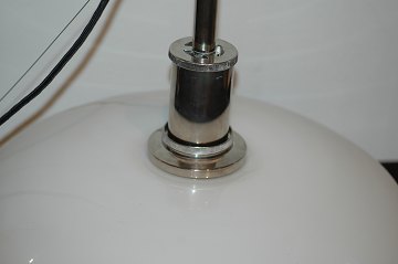 PH Poul Henningsen (1894-1967) 4½-4 pendel med skærme af mundblæst hvidt opal glas, lille afblændingskærm i aluminium og fatningsskjuler i forkromet aluminium. H. 41 cm. Diam. 48 cm