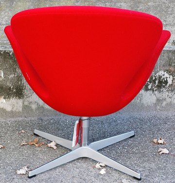 Arne Jacobsen (1902-1971), Svanen er betrukket m. rødt Hallingdahl uld. "Svanen" svæver på en satinpoleret aluminiumstjernefod m. drejefunktion og returdrej, skallen formet af fiberglasforstærket kunststof med skumpolstring.