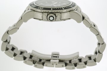 Automatisk herrearmbåndsur fra Mont Blanc, modelnr.: 29304 Stor sportsmodel af stål m. sort skive, sort krans m. sølvfarvede arabertal, safirglas, lænke af stål m. foldespænde, datomarkering ved 3" position. Ø. 38 mm.