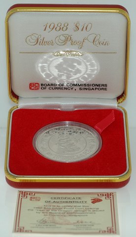 Singapore, 10 dollars SØLV 1988 Proof - "Dragens år" KM 69a
