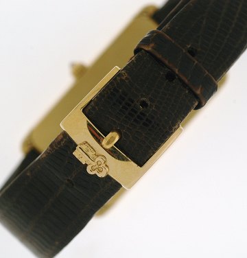 Corum herreur i guld med læderem, urværket er bygget ind i en guldbarre på 15 gr., dia. 24 x 41 mm.