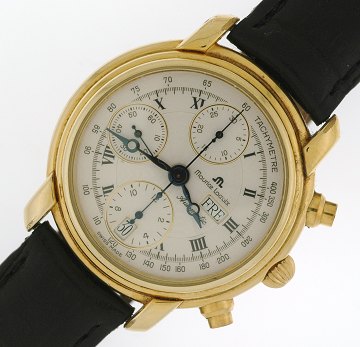 Maurice Lacroix Masterpiece Automatic guld/stål herreur med læderrem, tachymetre, safirglas, ugedag position 3", dato position 6", dia. 38 mm.