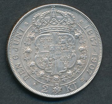 Sverige, 2 kr SØLV 1907 - "Oscar II & Dronning Sofias guldbryllup"