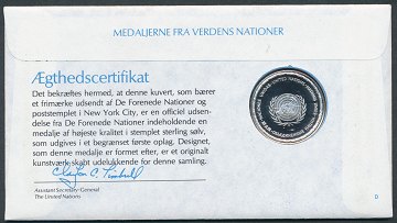 Medaillebrevet bærer desuden et frimærke udsendt af De Forenede Nationer og poststemplet i New York City.