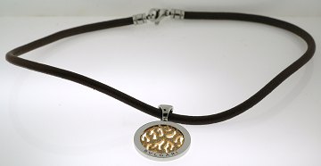 Halssmykke fra Bvlgari m. koralformet midterstykke af 18 kt. guld, prydet talrige brillantslebne diamanter, herom krans af stål. Vedhænget er isat brun læderrem m. lås af stål. L. 51 cm.