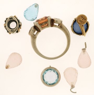 Samling ædelstene m. forskellige slibninger, bl.a. brioletteslebne rosenkvarts og topas, enkelt øreskrue af 14 kt. guld, formodentlig m. isat safir, Pandora charm af sterlingsølv m. stene samt ring af sterlingsølv m. fancycut halvædelsten, str. 54 1/2.