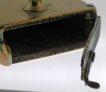 Strygejern af bronze med håndtag af træ, 1700-tallet. Med indgraveret initialer og låsetøj af smedejern. L. 17 cm.