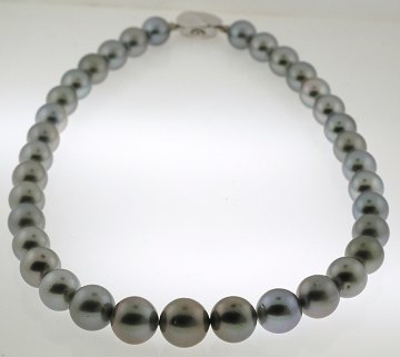 Perlekæde af høj kvalitet, m. south sea perler (fra ca. 11 mm. til 15 mm. i diam.), prydet m. lås af sølv. L. 46 cm.