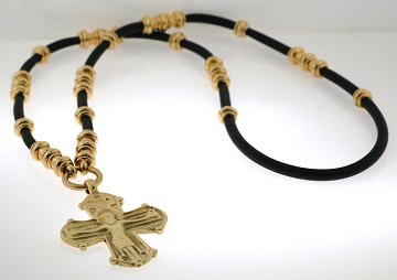 Stort dagmarkors af 18 kt. guld samt collier m. muffer, ligeledes af 18 kt. guld, trukket på sort gummirem. L. 66 cm. Smykket medfølges af en diamant på ca. 0,75 ct. W/P1, der tidligere har prydet korset.