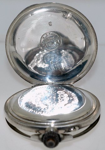 Fornemt herrelommeur i kasse af sølv fra Longines, model "Cronógrafo Contador" m. hvid emaljeret skive m. romertal, separat sekund- og minutskive, stopursfunktion, plexiglas, indvendigt stemplet "0,900". Ø. 50,5 mm.