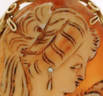 Kamé m. dekoration udført i fremstående relief i form af ung dame, prydet m. lille facetsleben smykkesten, isat vedhæng/broche af GULD. Ustemplet/bortpudset stempel. L. 48 mm.