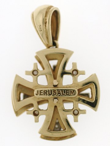 Vedhæng udført som kors af 14 kt. guld, prydet m. talrige brillantslebne diamanter på ialt ca. 0,165 ct. Korset er endvidere udsmykket m. emaljearbejde. Bagpå står der "Jerusalem". Stemplet "585".