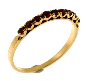 Ring af formodentlig 14 kt. guld, prydet med 9 facetslebne rubiner, Str. 54. Samlet vægt 1,35 gr.