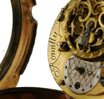 Romilly à Paris spindel lommeur af guld. Emailleret skive med romertal og arabertal samt stregindeks. Kapsel rundom dekoreret med talrige, gammelt diamantslebne sten samt ornamentik i form af blomster og bladværk. Bagkapsel ydermere prydet med usigneret, ovalt emailleportræt af en rococo skønhed. Spindelværk med dekortivt gennembrudt spindelbro stemplet "Romilly" og "Paris" samt "Leton". Dia. 42 mm.