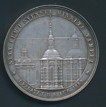 Medaille af sølv, præget i anledning af Oscar I´s død 1859. På rev. står der: "Nytt Rum i svenska Minnets Tempel - Upplätet d. 8. aug. 1859".
