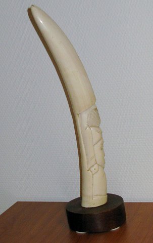Imponerende elefantstødtand m. udskåret figurmotiv i form af kvinde. Stødtanden står på træsokkel af nyere dato. H. 42cm.!!!