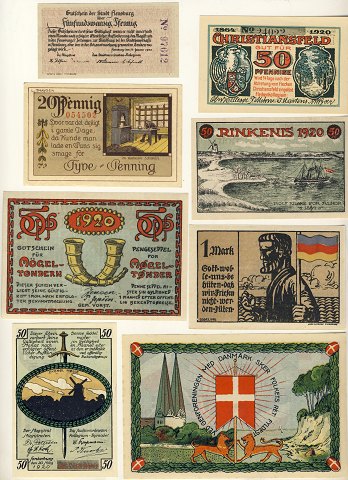 Samling spændende nødpengesedler fra det dansk-tyske grænseland. 12 stk. i ucirkuleret kvalitet.