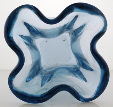 Blomstervase af mundblæst glas udført i organisk form, typisk for Holmegaard i 1950-60, fremstår dog usigneret. H. 15 cm.