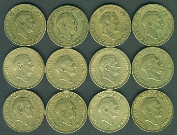Samling gule 2 kroner: 1947,-48,-49,-51,-52,-53,-54,-55,56,-57,-58,-59
