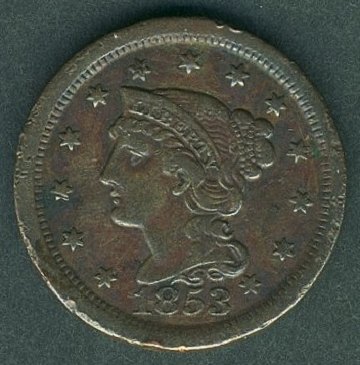 USA, cent 1853 - KM 67 - Ændret fra "One Cent" til "O Cunt"
