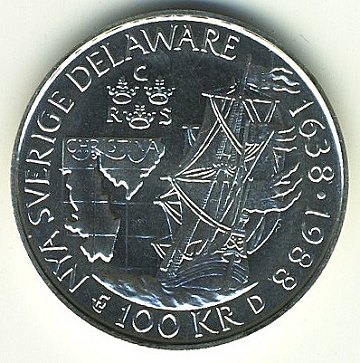 Sverige, 100 kr STERLINGSØLV 1988 (lille hoved) ucirkuleret - 350 års minde om Delaware