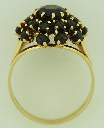 Ring af 14 kt. guld, prydet m. talrige facetslebne granater. Str. 59.
