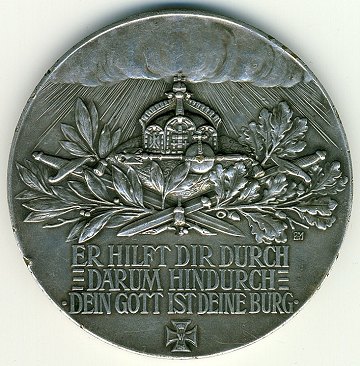 Stor sjælden tysk medaille, af forsølvet bronze, fra 1. verdenskrig, præget i krigen begyndelse 1914-1915. På fs. ses en ridder til hest m. hævet sværd og skjold m. den tyske ørn, hvor over "GOTT MIT UNS" og under "1914/15" er præget. På bs. ses krone, septer og æble liggende i grene m. krydsede sværd, hvorunder "ER HILFT DIR DURCH=DARUM HINDURCH=DEIN GOTT IST DEINE BURG" er præget. Under denne tekst er jernkorset af 1814. Ø. 60 mm. Vægt: ca. 90 gr.