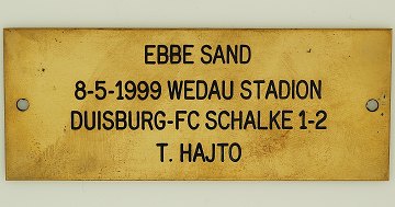 Spillertrøje båret af Ebbe Sand d. 8-5-1999 i kampen Duisburg-FC Schalke 1-2 på Wedau Stadion. Trøjen er professionelt indrammet (77x98 cm), og medfølges af en messingplakette, hvor navn, kamp og resultatet er indgraveret.