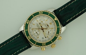 Herrearmbåndsur af mærket Sector Sport, i kasse af delvist forgyldt stål, læderrem, sølvfarvet skive m. stregindeks og arabertal, chronograffunktion, justérbar lynette i grøn/guld, safirglas, quartzurværk. Ø. 42 mm.