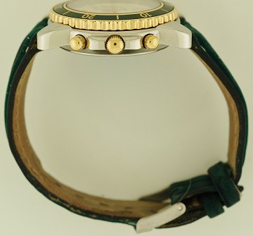 Herrearmbåndsur af mærket Sector Sport, i kasse af delvist forgyldt stål, læderrem, sølvfarvet skive m. stregindeks og arabertal, chronograffunktion, justérbar lynette i grøn/guld, safirglas, quartzurværk. Ø. 42 mm.