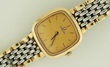 Damearmbåndsur af delvist forgyldt stål, kanneleret guldskive m. stregindeks, safirglas, quartzurværk. Ø. 20 mm.