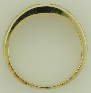 Ring af 8 kt. guld, formodentlig prydet m. en facetteret hvid safir. Str. 58.